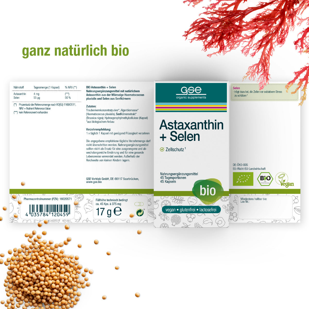 Nahrungsergänzungsmittel mit natürlichem Astaxanthin aus der Mikroalge Haematococcus pluvialis und Selen aus Senfkörnern