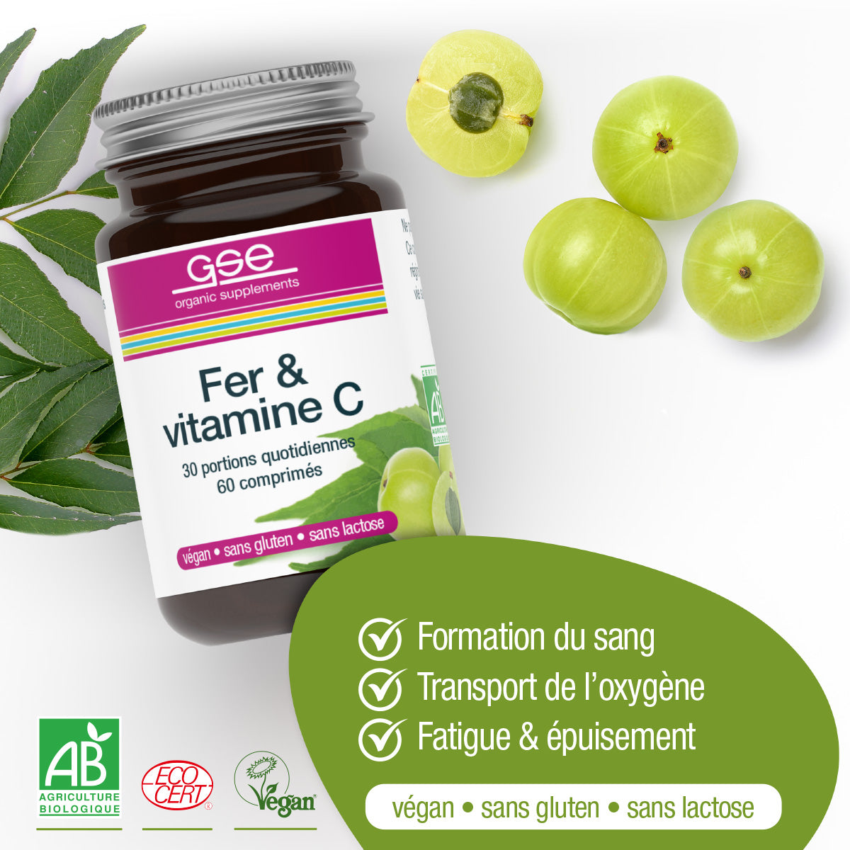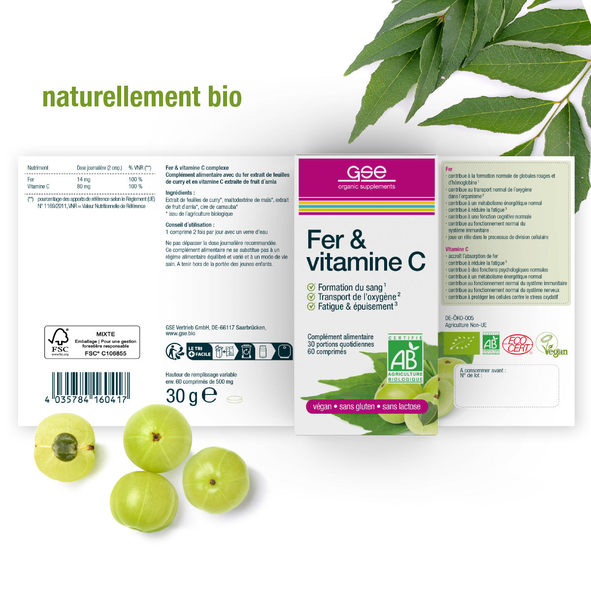 Notre complexe Fer et Vitamine C Bio est un complément alimentaire de haute qualité, 100 % végétal, qui soutient votre énergie. Véritable concentré d'énergie, il associe le fer végétal issu des feuilles de curry naturelles à la vitamine C issue de l'amla bio, riche en nutriments.