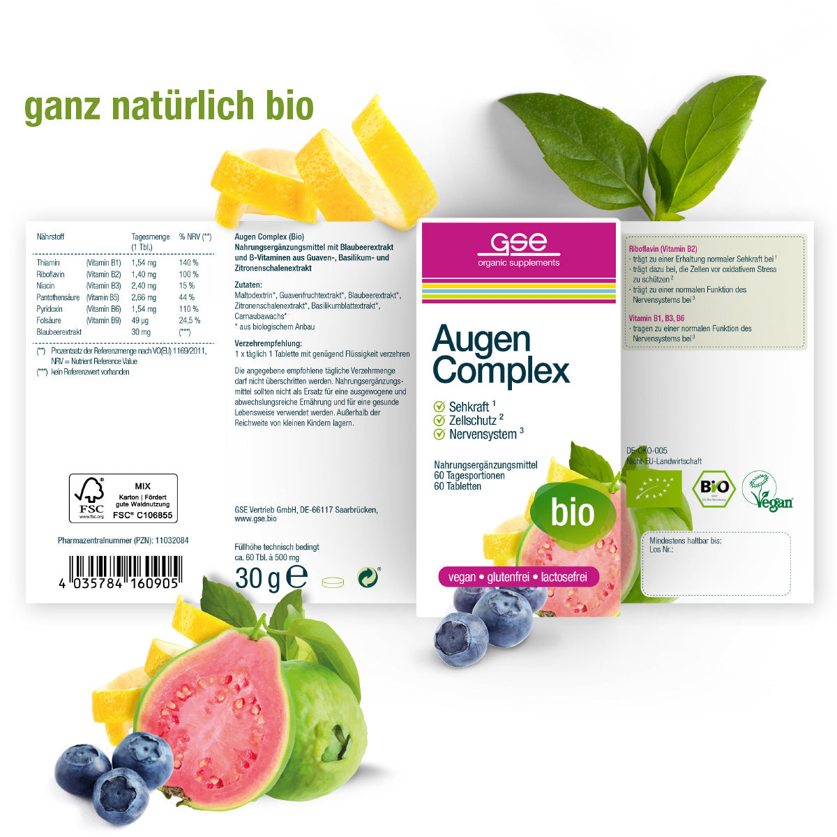 GSE utilise de l'extrait de myrtille biologique pour son produit Augen Complex. L'extrait de myrtille contient naturellement des anthocyanes, qui sont les colorants de la myrtille. Les vitamines B sont obtenues à partir d'extraits de fruits de goyave, de feuilles de basilic et d'écorce de citron.