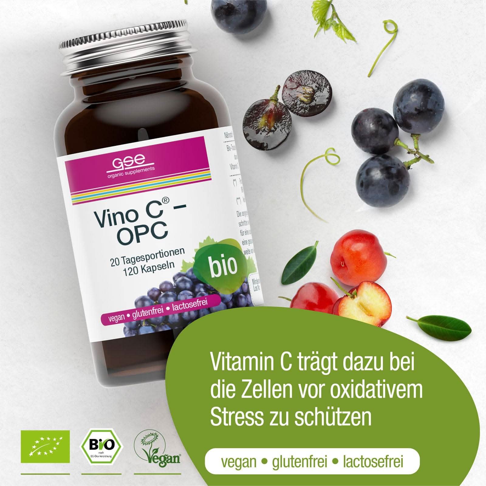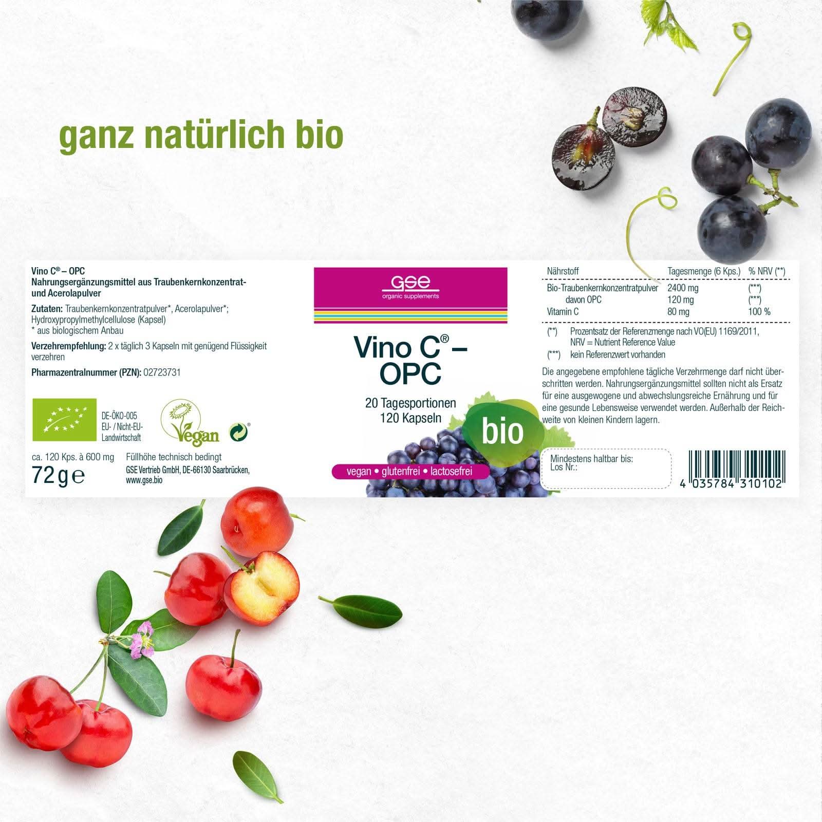 Consommer 3 gélules de 600 mg 2 fois par jour avec suffisamment de liquide.Une gélule de Vino C®-OPC contient 400 mg de poudre de concentré de pépins de raisin pure et 100 mg de poudre d'acérola.